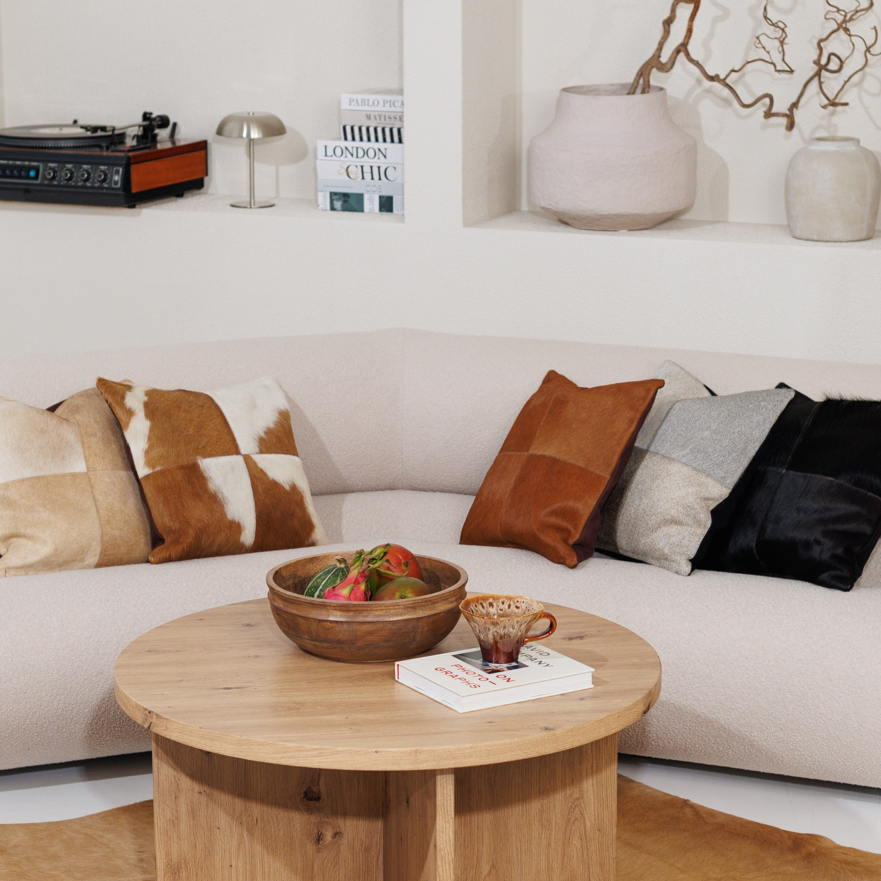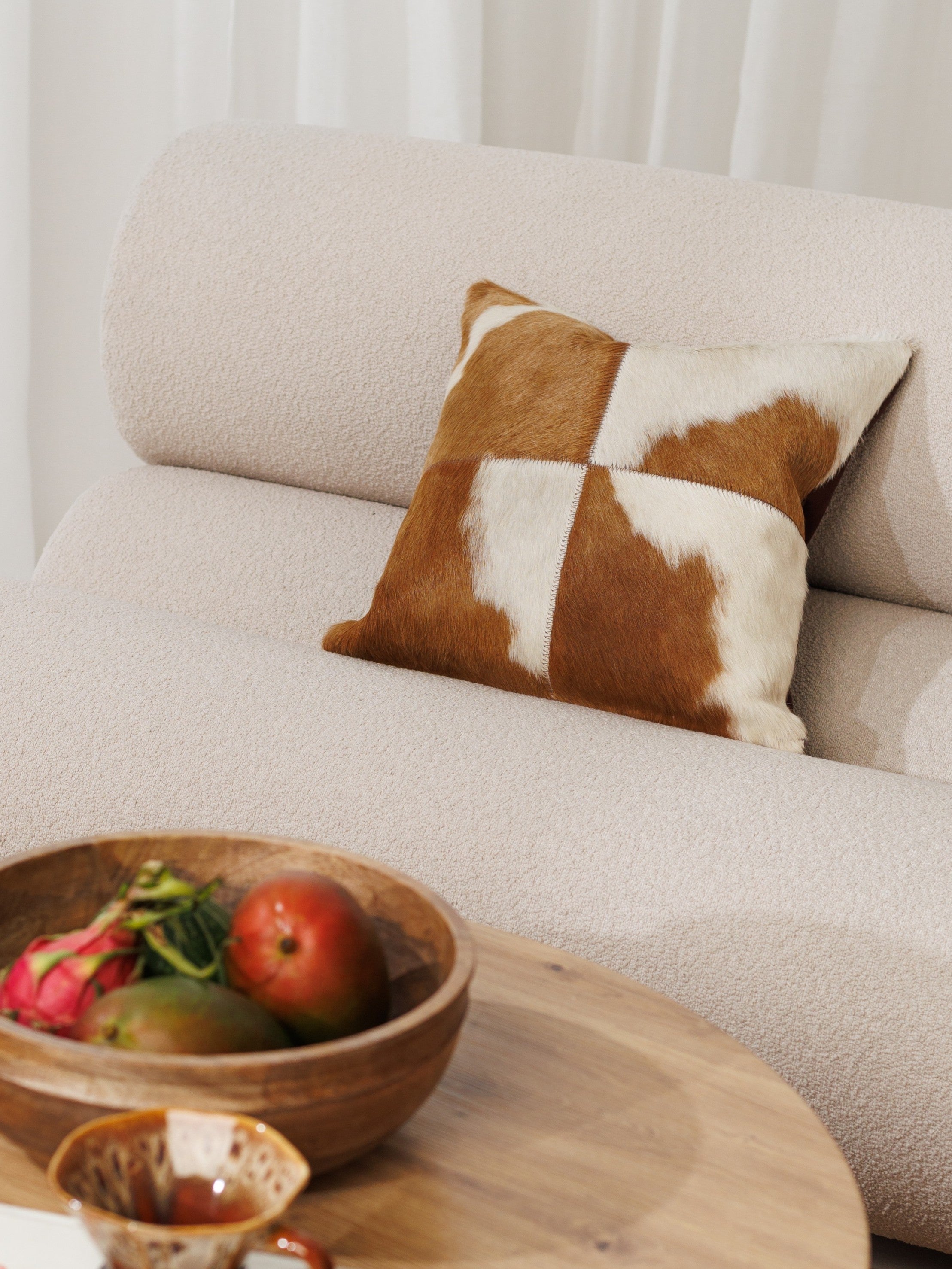 Kukin tyyny on valmistettu käsin neljästä aidosta lehmännahkapalasta, mikä tarjoaa ainutlaatuista luonnetta. Pehmeä ja luonnollinen karva ja maanläheiset sävyt tekevät siitä täydellisen aksentin mukaviin olohuoneisiin, makuuhuoneisiin tai rauhallisiin olotiloihin.